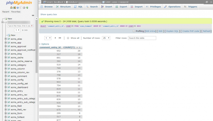 SELECT `comment_entry_id`, COUNT(*) FROM `acms_Comment` GROUP BY `comment_entry_id` ORDER BY COUNT(*) DESC